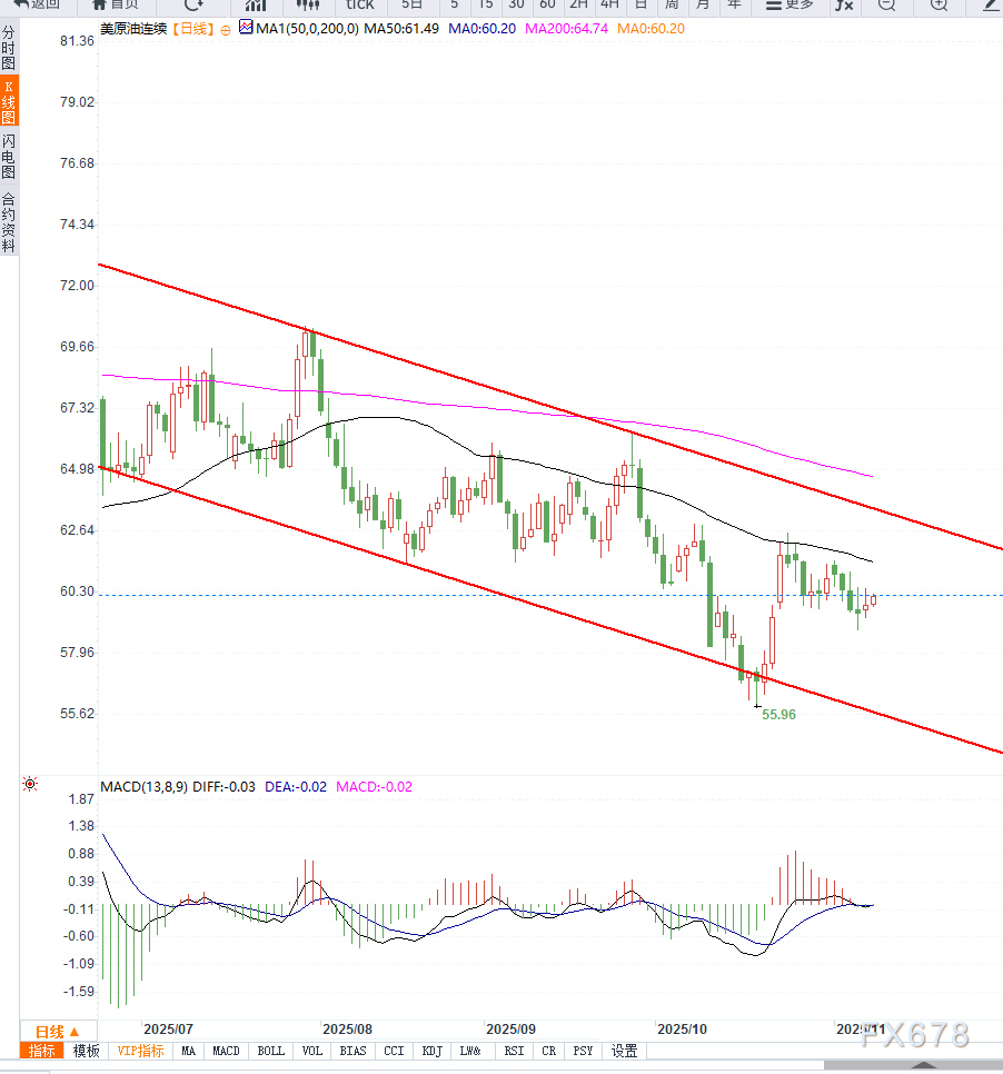 技术层面显示,美原油日线图形依然处于下降趋势线之内,且均线维持空头运行,而MACD指标连续调整之后存在反弹的需求,短期大幅下行的概率不大,日线级别均线压力61.30成为短期多空分水岭。