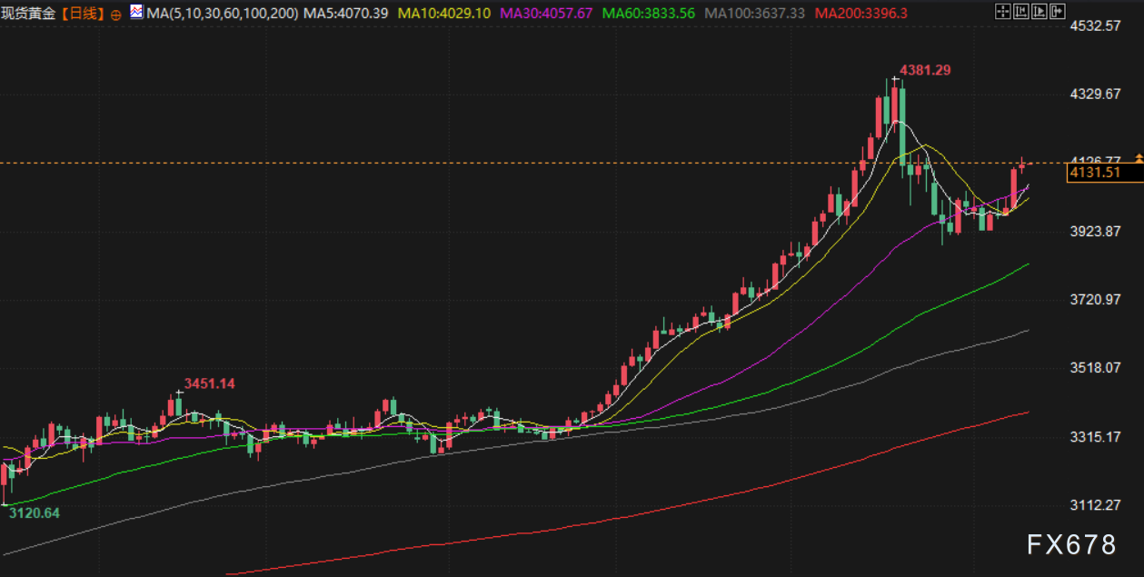 金价周二延续涨势,现货金上涨0.3%至每盎司4126.77美元,创下近三周以来最高水平。市场预期美国政府停摆即将结束,而随之恢复发布的经济数据可能为美联储下月降息创造条件,这为金价提供有力支撑。